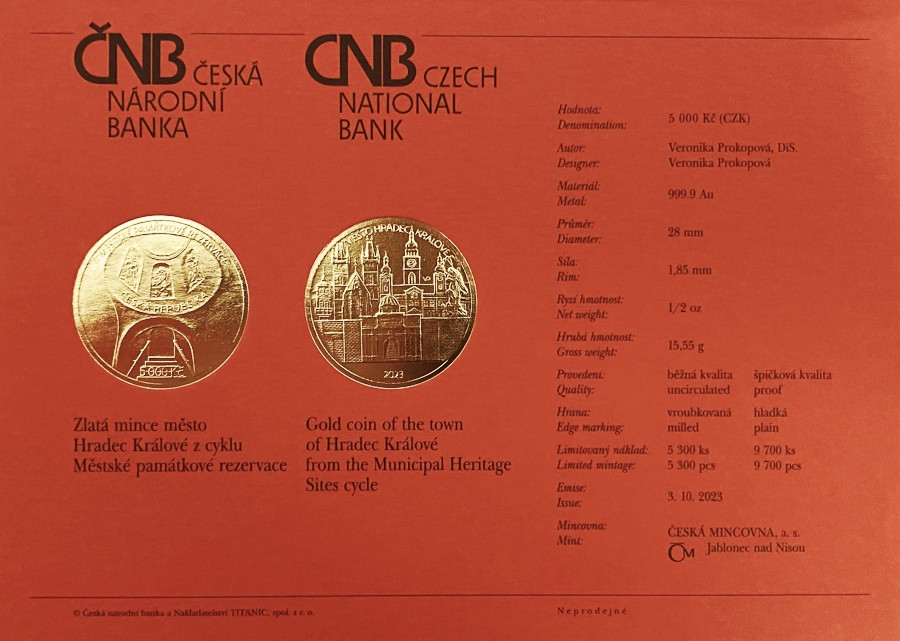 Zlatá mince ČNB 5.000 Kč Hradec Králové STANDARD 1/2 oz