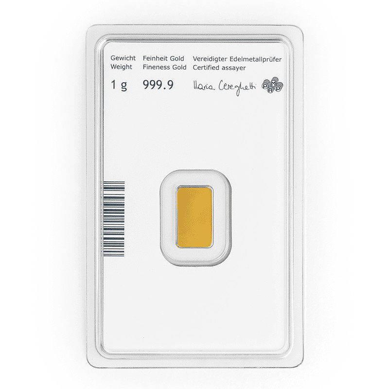 Zlatý investiční slitek o váze 1g má k hmotnosti kovu relativně vyšší ražební náklady. Je proto vhodný především jako dárek nebo originální propagační předmět.
